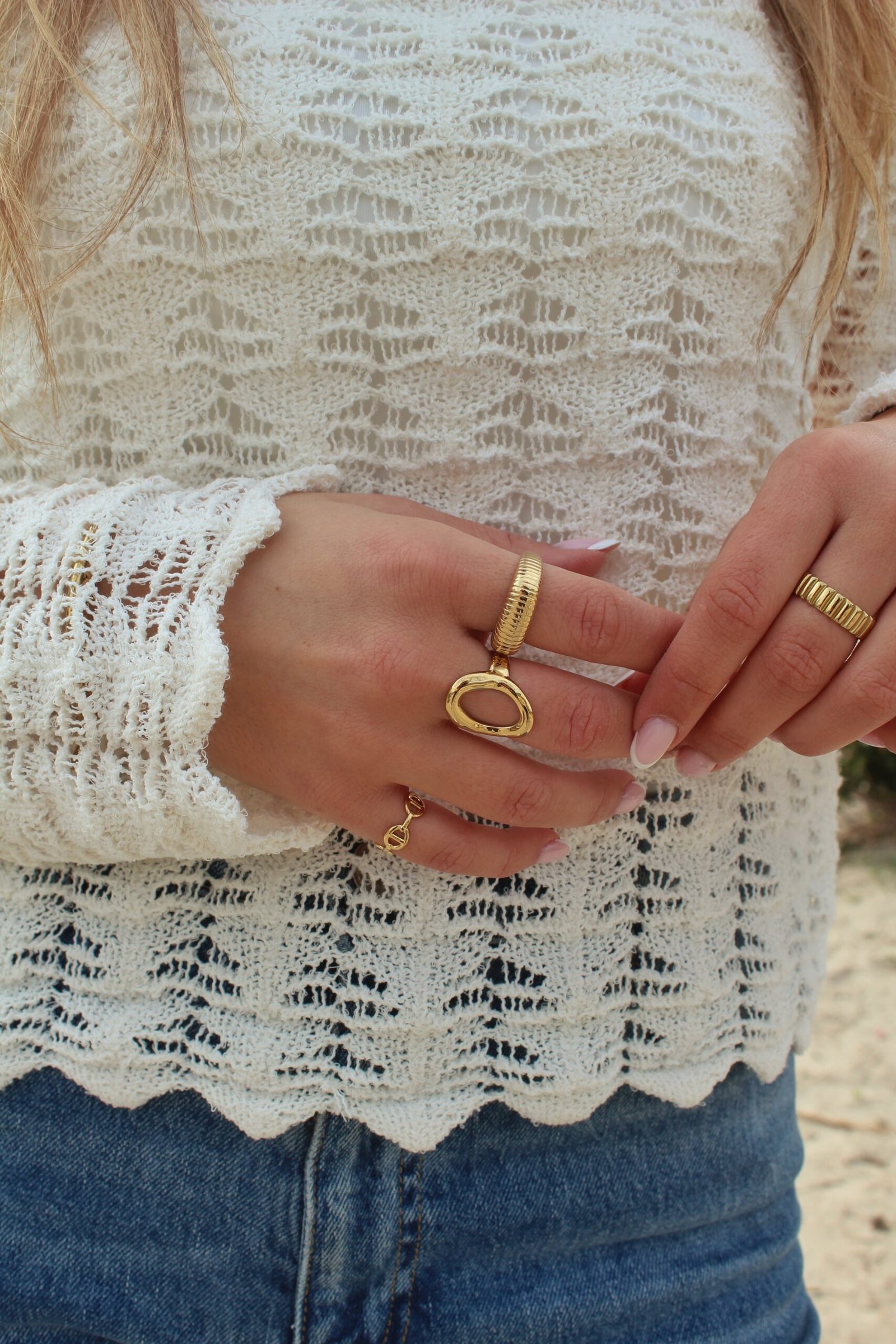 Bague dorée ou argentée anneau carré strié en acier inoxydable. Matière hypoallergénique qui ne s’oxyde pas au contact de l’eau.