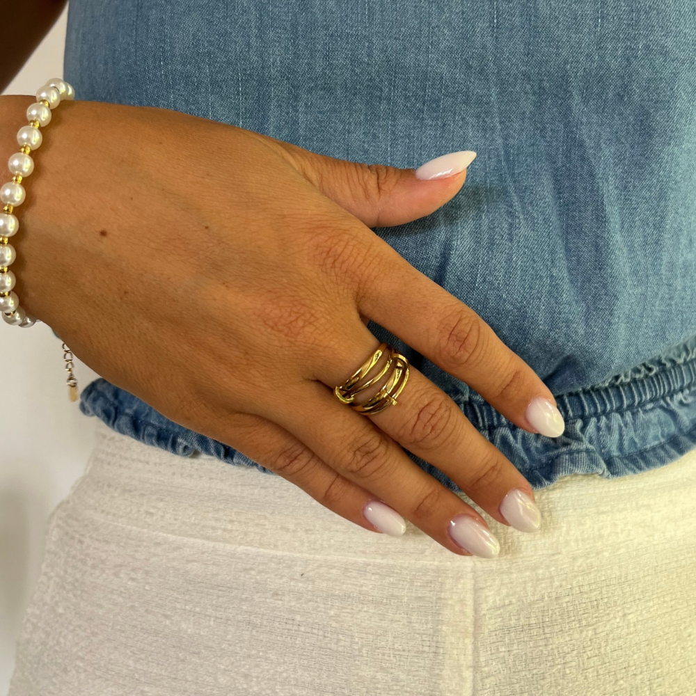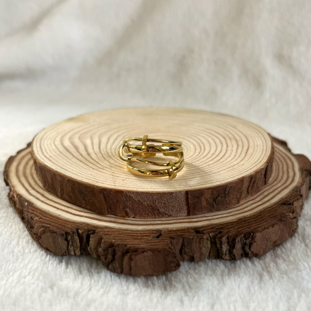 Bague dorée multi lignes et crochets ajustable en acier inoxydable.