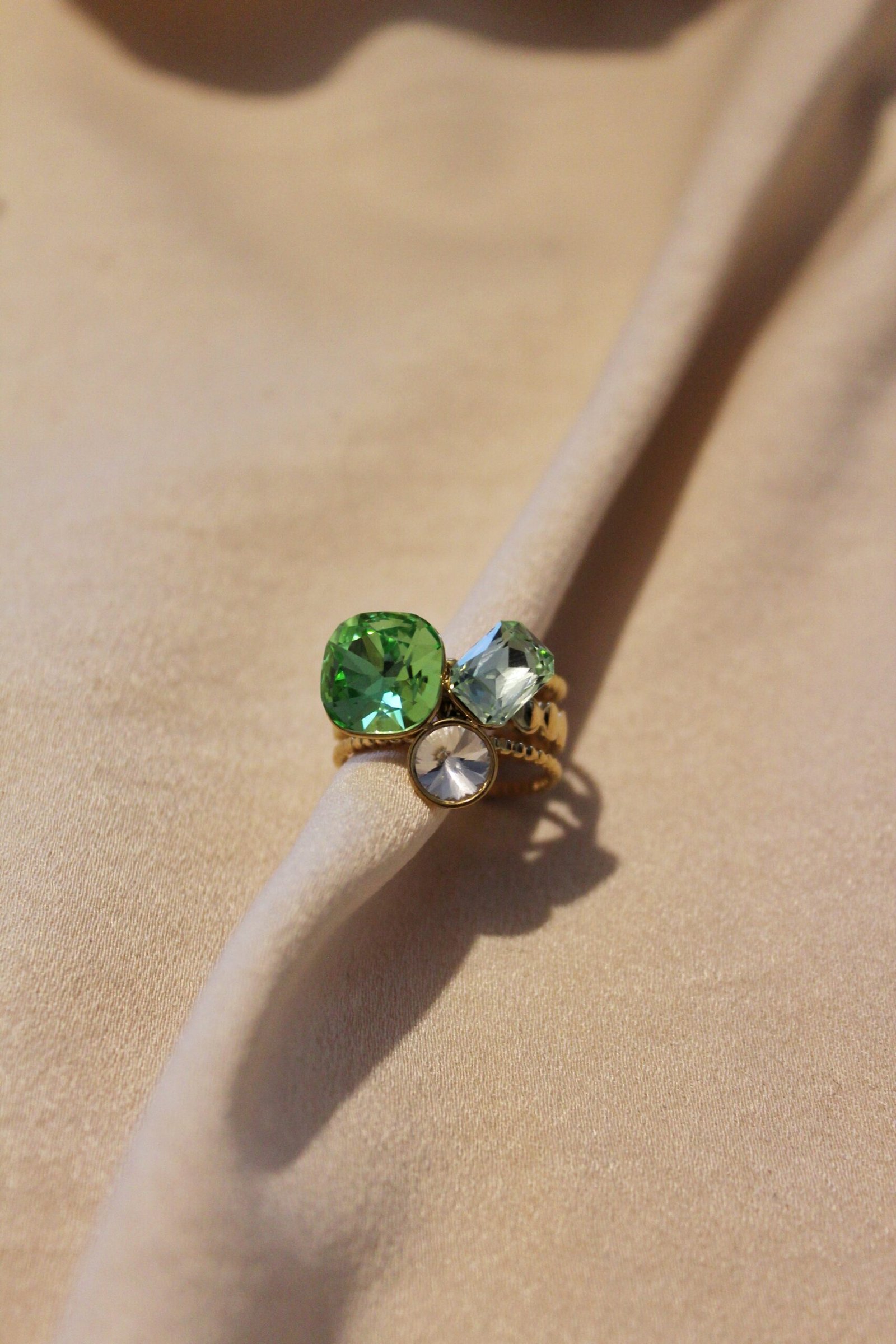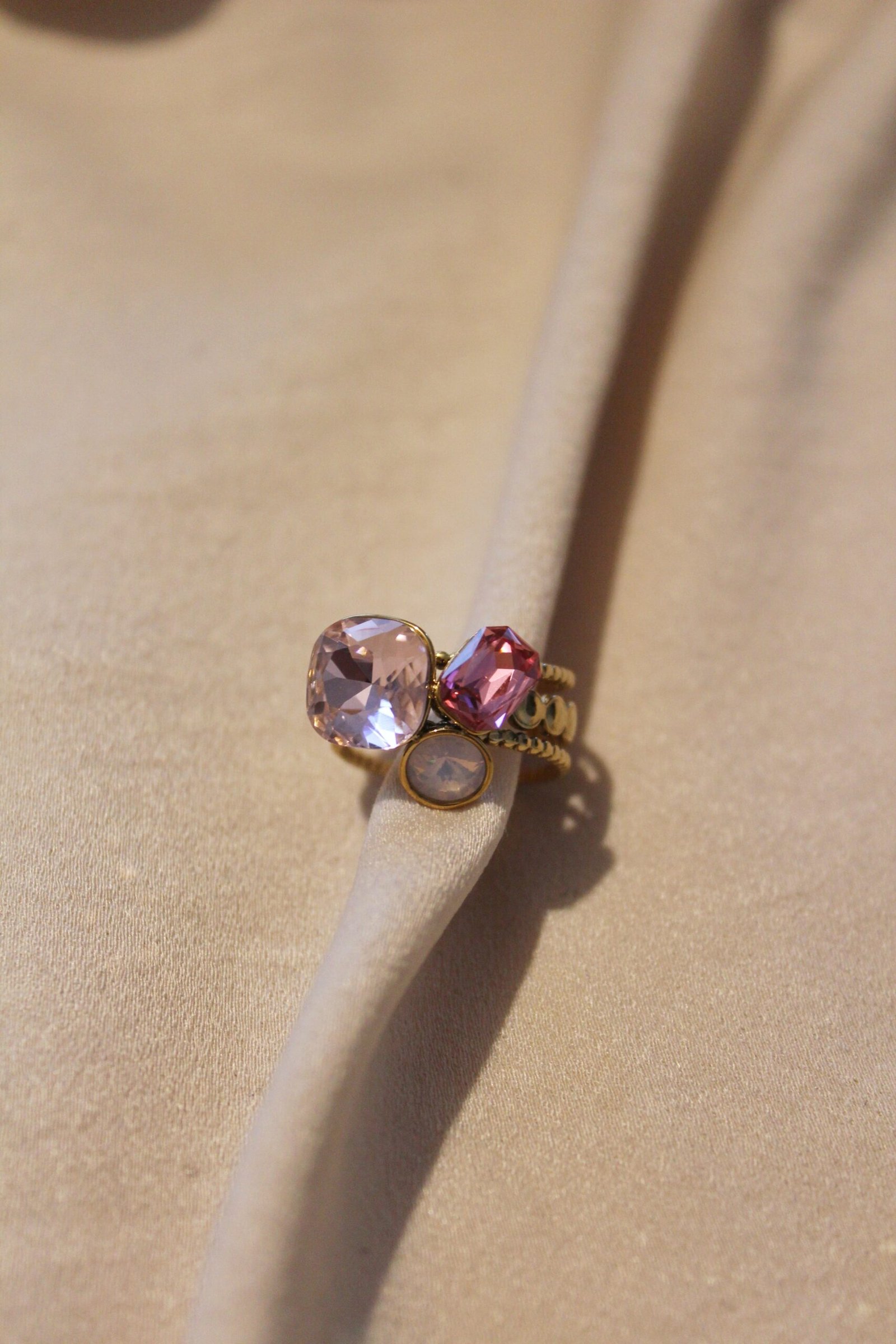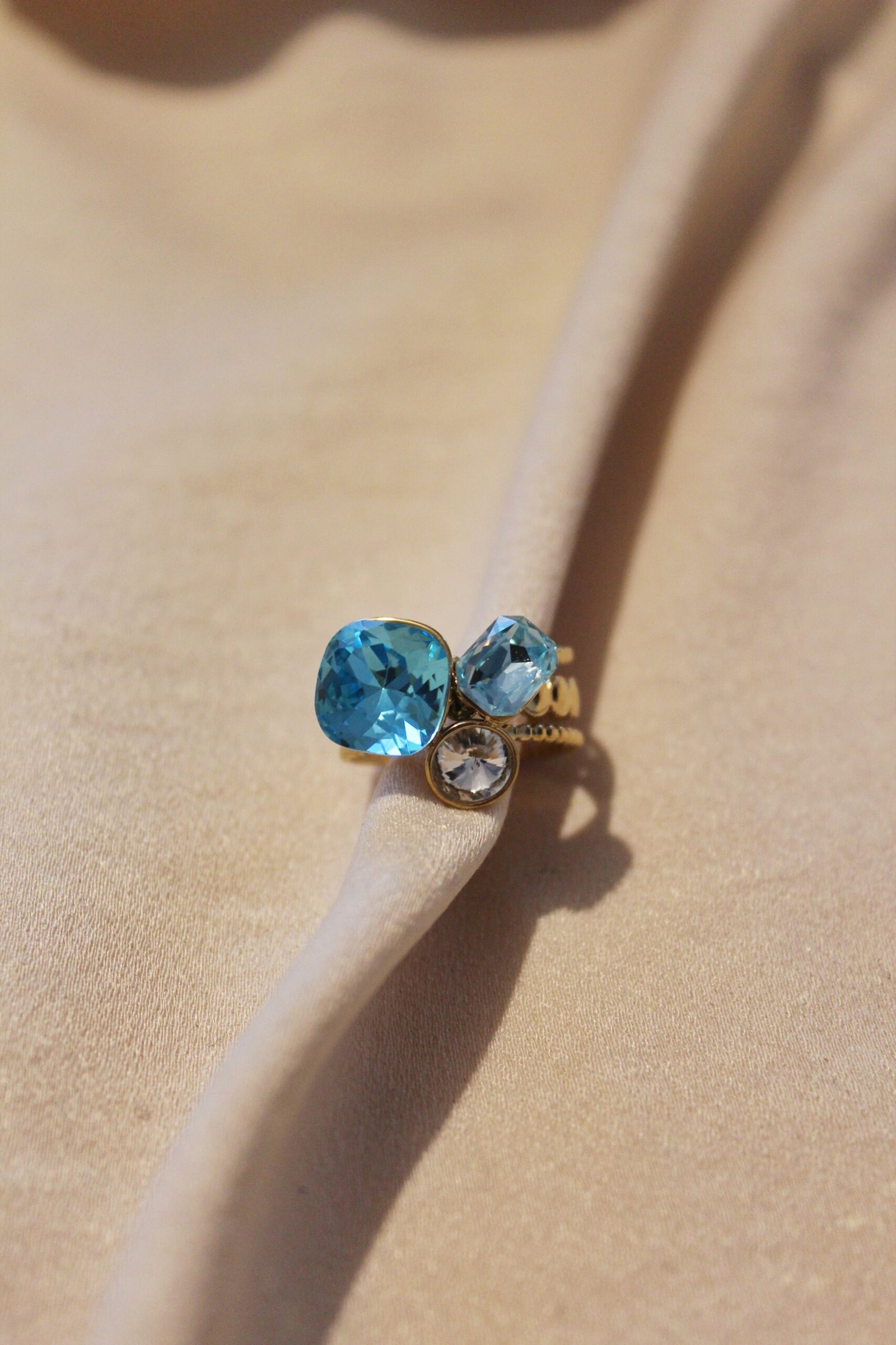 Bague dorée ornée de strass et cristal clair. Disponible en bleue, rose ou verte.
