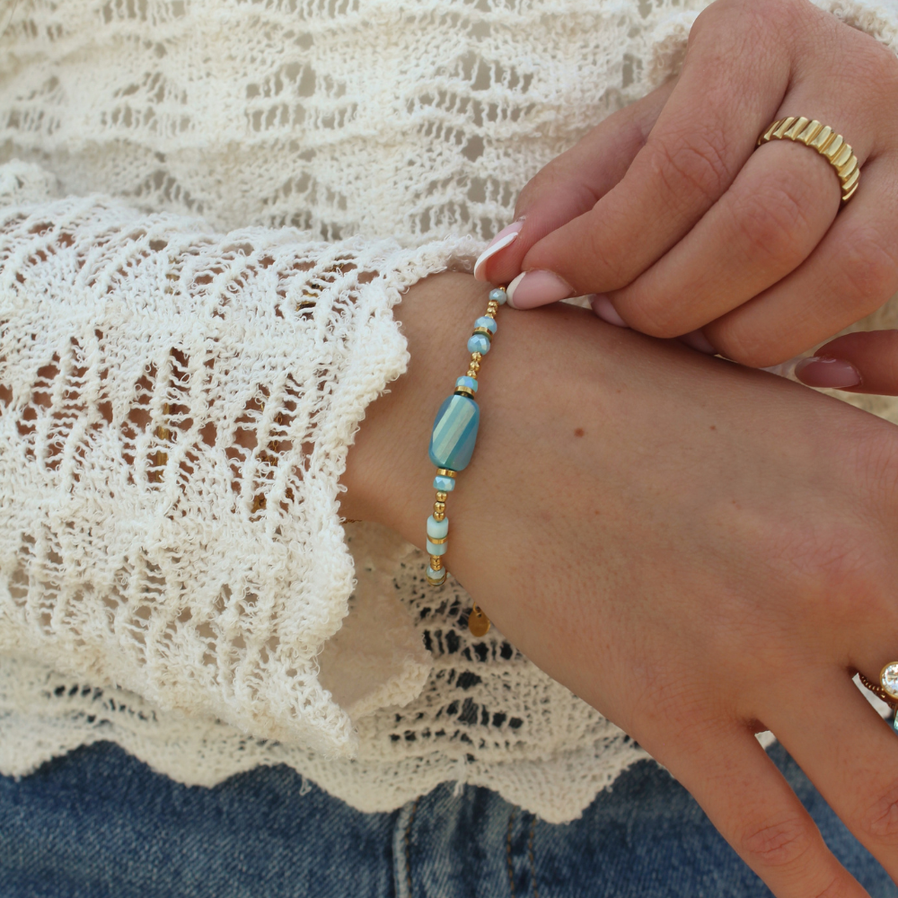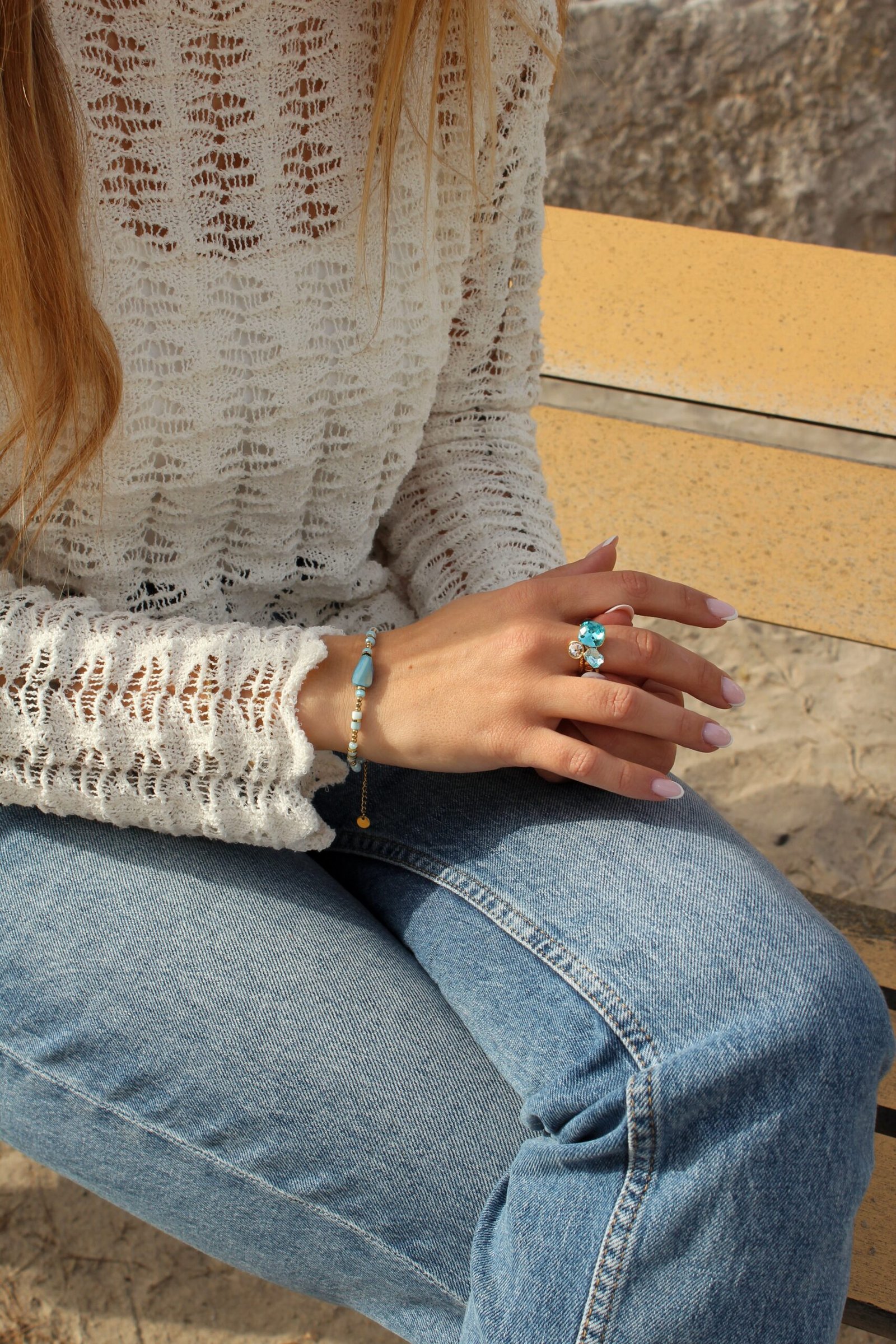 • Bracelet doré avec perles bleues ciel avec pierre facettée centrale