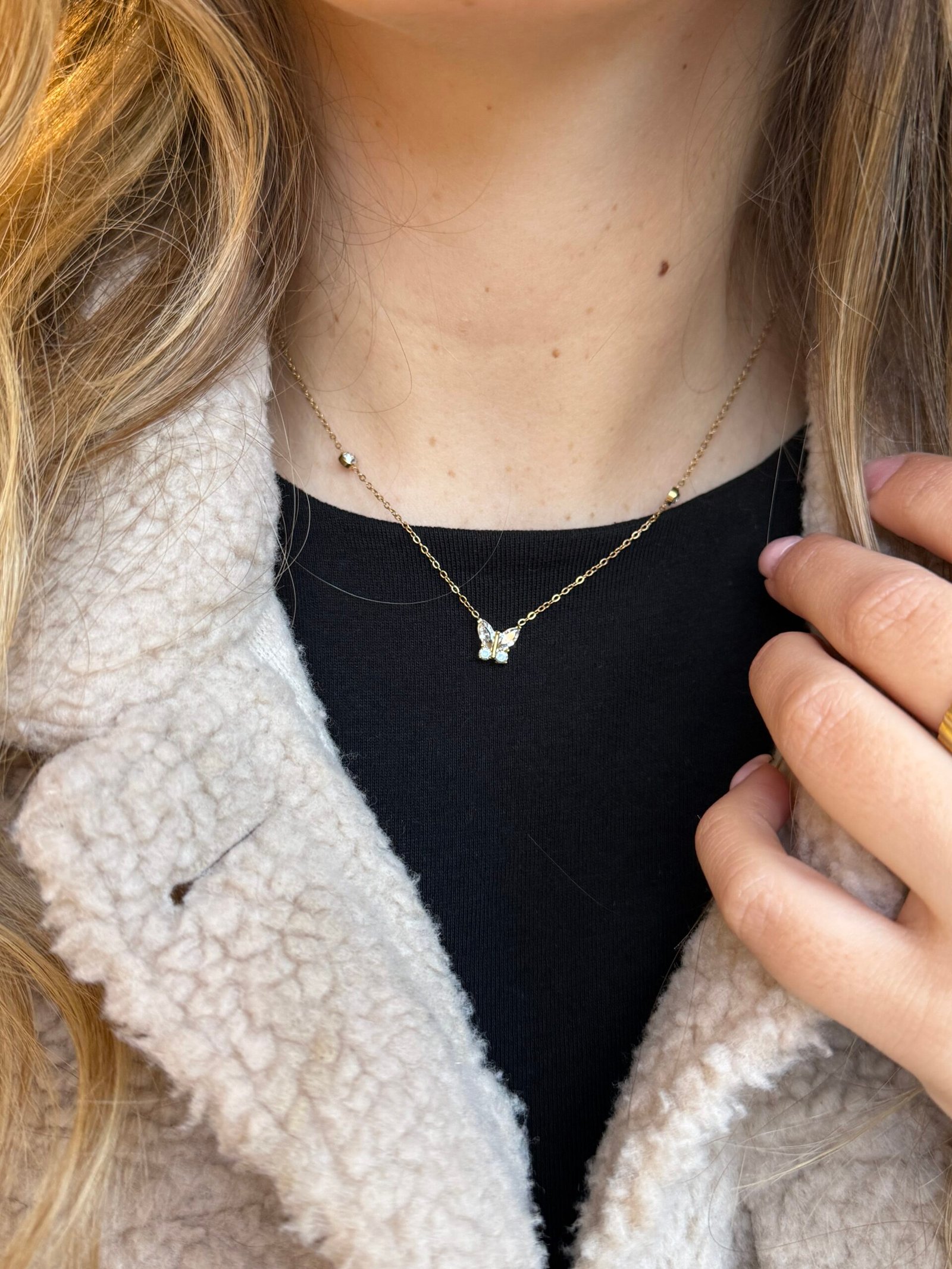 Collier doré chaine fine avec pendentif papillon strassé et deux strass en acier inoxydable.