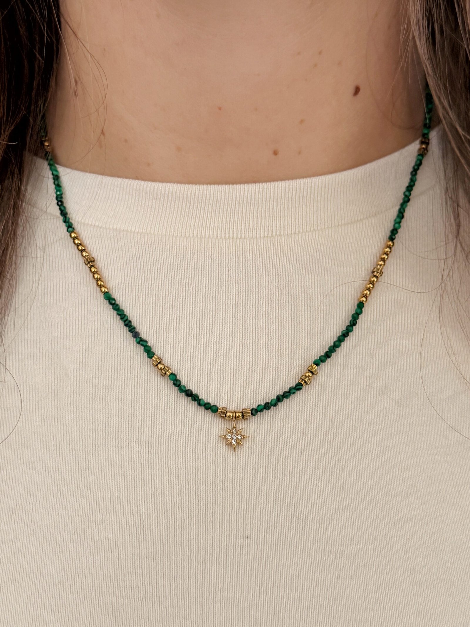 - Collier doré chaîne de pierres naturelles vertes avec pendentif étoile à strass