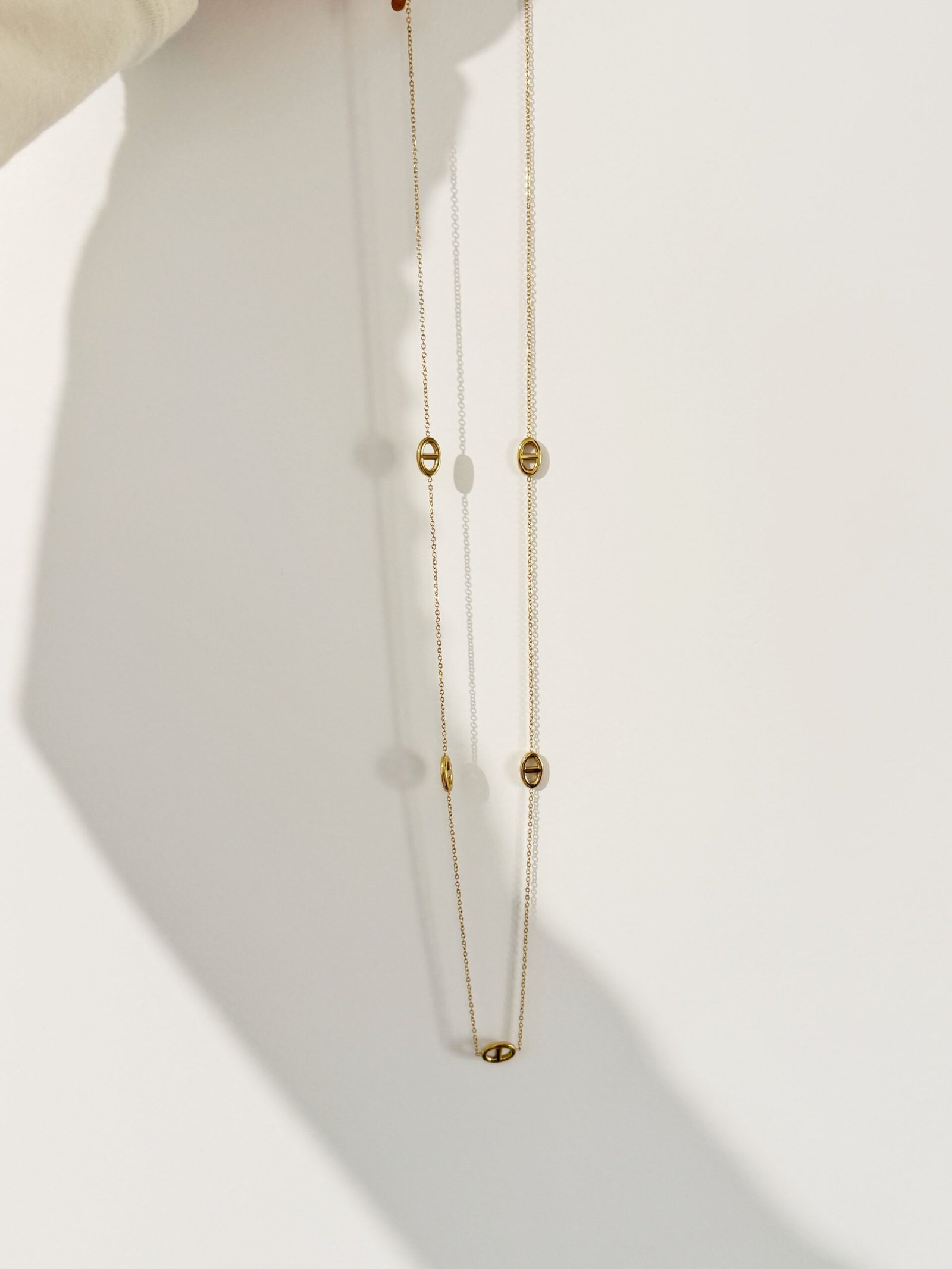 Collier sautoir à maillons, disponible en argenté ou en doré en acier inoxydable.